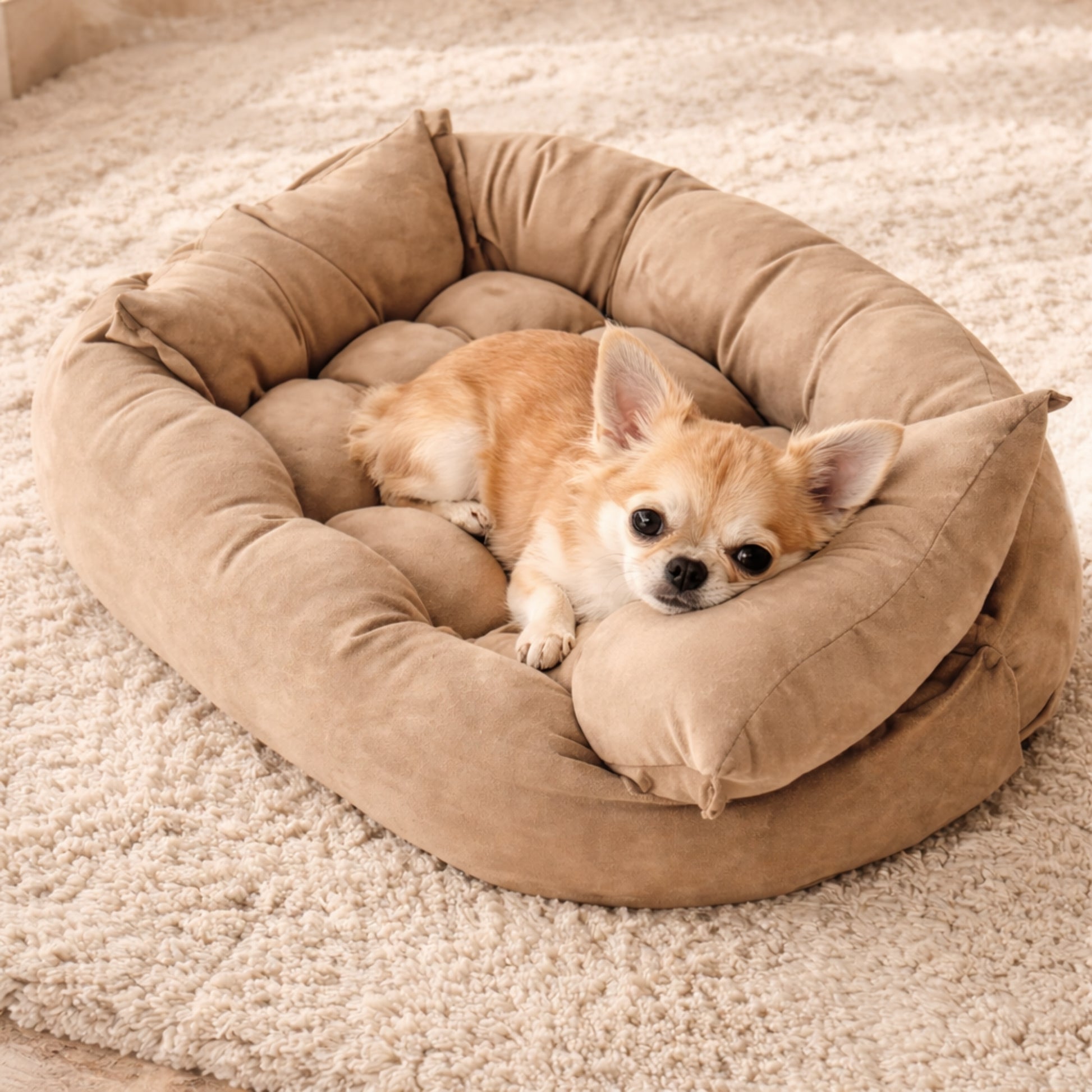 En relevant les côtés, le tapis devient rapidement un panier enveloppant, créant un effet cocon très apprécié des chiens. Ils peuvent s’y blottir, s’installer dans un coin ou poser leur tête sur les rebords pour se reposer plus confortablement.